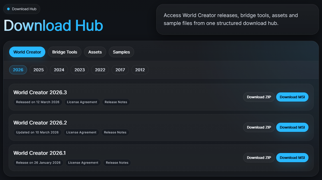 The Download Hub let's you access World Creator releases, bridge tools, assets and sample files: