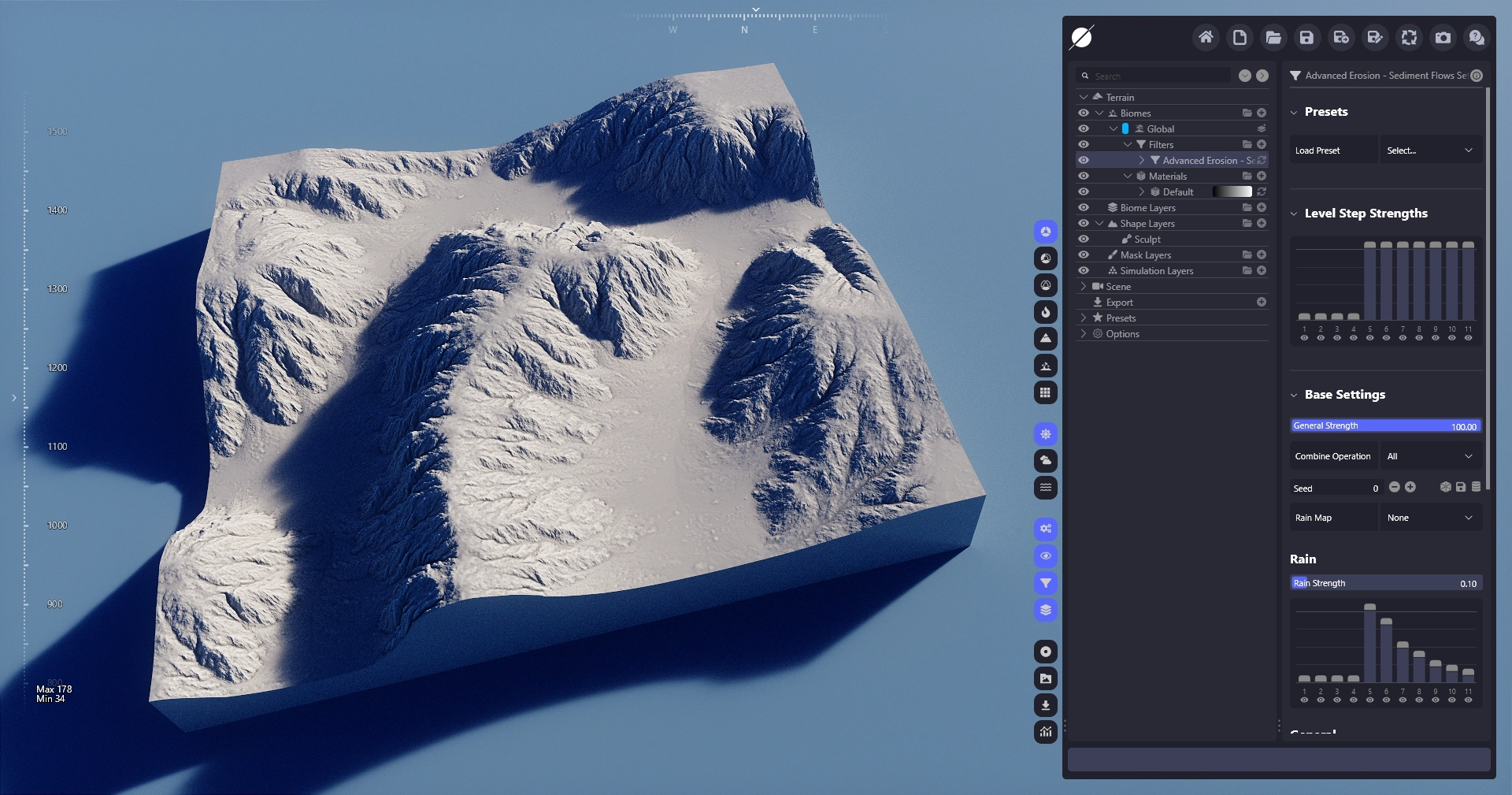 We will now add a [Soft Flows Erosion](https://docs.world-creator.com/reference/terrain/biome/filters/basic-erosion/soft-flows) filter. This filter is a simple erosion algorithm that uses water particles to simulate the erosion and deposition of sediment. Once you have added it, you can browse the various [presets ](https://docs.world-creator.com/reference/presets)at the top of the filter settings to quickly change the look of the filter, or you can manually adjust all the parameters that the filter uses to tweak it to your liking.
